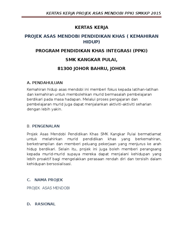 KERTAS KERJA PROJEK ASAS MENDOBI PENDIDIKAN KHAS KEMAHIRAN HIDUP PROGRAM PENDIDIKAN KHAS INTEGRASI PPKI SMK KANGKAR PULAI 81300 JOHOR BAHRU JOHOR A. Nak berjinak-jinak dalam bidang usahawan ni. 13042021 by email protected Contoh Kertas Kerja 2021Format Terkini.